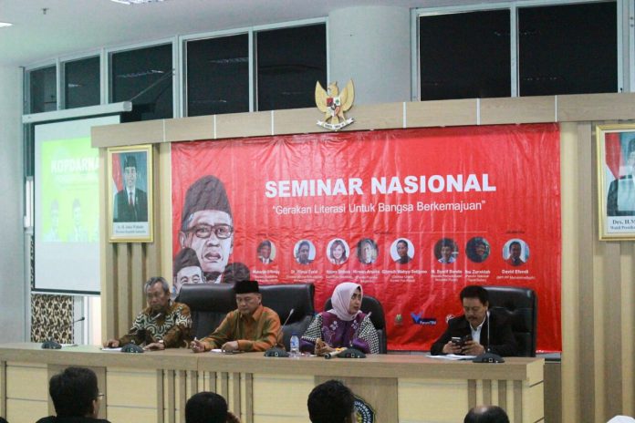 “Untuk menggembirakan kegiatan ini dirangkai dengan seminar nasional bertema “gerakan literasi untuk bangsa berkemajuan” dengan narasumber nasional dan berkompeten seperti Kepala perpustakaan nasional, M Syarif Bondo, tokoh Pendidikan inspiratif Bidan Suraida (pendiri sekolah Tapal Batas), Kemendikbud RI, Nirwan Arsuka (presiden Pustaka Bergerak Indonesia), dan perwakilan kantor pos yang memiliki program mendorong gerakan literasi”, lanjutnya.
